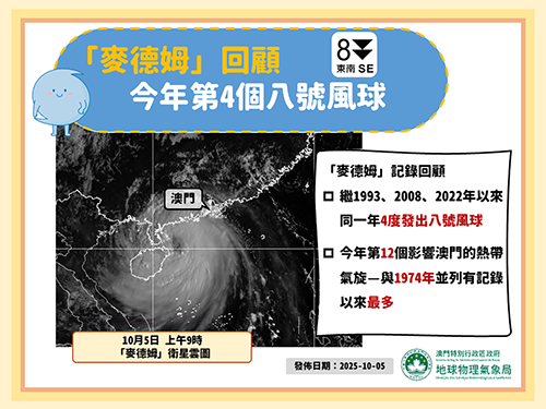 氣象局總結“麥德姆”吹襲本澳時提到,“麥德姆”為今年第12個影響本澳的熱帶氣旋,與1974年並列為有記錄以來發出最多熱帶氣旋信號的年份,同時亦是繼1993、2008、2022年以來,再度於同一年內需要4度發出八號風球。