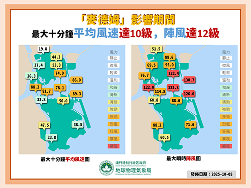 氣象局表示,受“麥德姆”影響,自前日午夜起,珠江口地區普遍受烈風或以上風力影響。回顧熱帶氣旋信號生效期間,本澳各區錄得最大10分鐘平均風速達10級,最高陣風達12級。此外,內港一帶部分低窪地區昨早亦曾出現輕微風暴潮水浸。