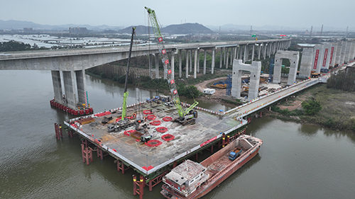 這邊橋樑主塔不斷攀升新高度,那頭架樑施工也逐漸延伸里程。中鐵二十五局承建了深江鐵路12標段13.41公里正線、545榀箱樑制運架以及全線鋪軌任務,在完成單線樑架設任務後,項目團隊又緊張地拼裝起雙線架橋機,加快後續施工進度。“我們剛完成單線92榀箱樑架設全部任務,馬上要開展雙線樑的架設,現場採取工序輪休制,施工推進平穩有序。”來自湖南懷化的中鐵二十五局架樑施工負責人陳向東介紹。