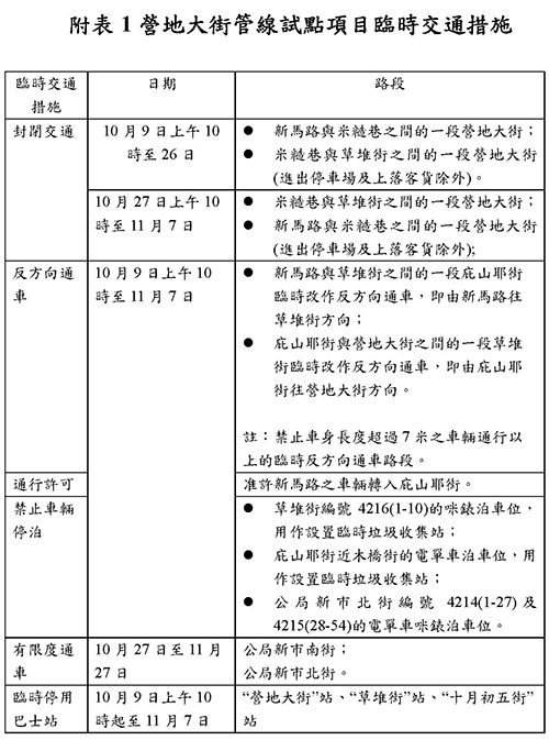 相關工程將分三階段進行,其中,第一階段(10月9日起至10月26日)及第二階段(10月27日至11月7日)期間,營地大街將分段實施封閉交通,並透過將庇山耶街和草堆街的部份路段改為反向行車,讓車輛能夠到區內上落客貨及進出停車場,保持區內的交通循環,而治安警察局亦會派員指揮交通,維持交通和上落客貨秩序;第三階段(11月8日至11月27日)施工範圍集中在區內的內路,因此,原封閉交通和反方向行車的營地大街、草堆街和庇山耶街將於11月8日上午10時起恢復原有行車安排。