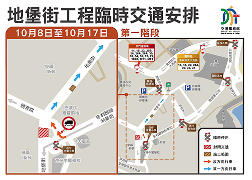 交通事務局介紹,相關工程由今日起至10月17日展開首階段施工,期間因應地堡街實施通行車輛長度限制,多條途經氹仔舊城區的公共巴士路線需改道行駛,並臨時不停靠舊城區內的若干個巴士站點,乘客可前往設置於奧林匹克大馬路近華南工業大廈的臨時站或“澳門運動場”站乘搭相關巴士路線,詳情可參閱兩巴網站(澳巴:https://www.tcm.com.mo、新福利:https://www.transmac.com.mo)。後續施工階段10月18日起將恢復公共巴士的行駛路線及停靠站點。