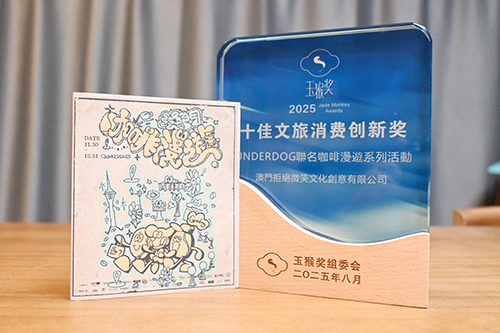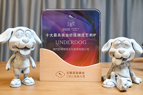 “玉猴獎”創辦於2016年,其命名蘊含“精雕細琢,璞玉成器”之義,是內地第一個以市場價值為評選標準的IP產業獎項。“第八屆玉猴獎中國原創IP盛典”早前於深圳舉行,澳門創意品牌SEM SORRISO(拒絕微笑)旗下的IP UNDERDOG被評選為“2025年度十大最具商業價值潮流藝術IP”,同時憑藉“UNDERDOG 聯名咖啡漫遊系列活動”獲得“2025年度十佳文旅消費創新獎”。