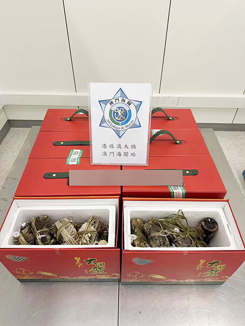 11月25日,海關人員在關閘口岸出境旅客檢查區發現一名男性澳門居民步態異常,經檢查,發現該男子將65件記憶卡藏在衣物及隨身物品內,試圖將之偷運出境。同日,海關人員透過風險管理系統的預警佈控,在港珠澳大橋澳門口岸入境車道截查一輛跨境車輛,駕駛者為男性澳門居民,經檢查,發現該男子試圖將38公斤大閘蟹偷運入境。