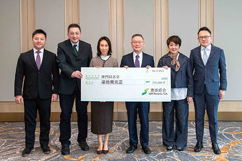 善款支票遞交儀式日前於澳門新葡京酒店舉行,澳娛綜合常務董事何超鳳、董事兼員工福利諮詢委員會主席梁安琪將善款支票遞交同善堂,由值理會主席崔世平、副主席黃焯華、值理蔡明威及蘇國夫代表接受。