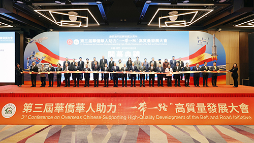 【本報訊】由中華全國歸國華僑聯合會、澳門歸僑總會主辦的“第三屆華僑華人助力‘一帶一路’高質量發展大會”昨日下午3時假澳門旅遊塔會展娛樂中心舉行。本屆大會以“五洲聚澳 • 綠路啟新”為主題,匯集來自80 個國家和地區的近千名華僑華人領袖、工商界代表、專家學者及青年才俊,共同探討“一帶一路”高質量發展的新路徑、新動能與新未來。
