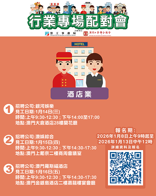 據勞工局公佈,三場配對會由下週三(14日)至週五(16日)一連三日舉行。其中,下週三全日在澳門大倉酒店28樓蘭花廳舉辦“新銀河娛樂2006有限公司”專場配對會,提供40個職位空缺,涉及前台值班經理、禮賓助理經理、副總廚(日本餐)、餐飲主任、廚師領班(環球美食/法餐/宴會)、中級廚師(環球美食/法餐)及餐飲服務員等崗位。