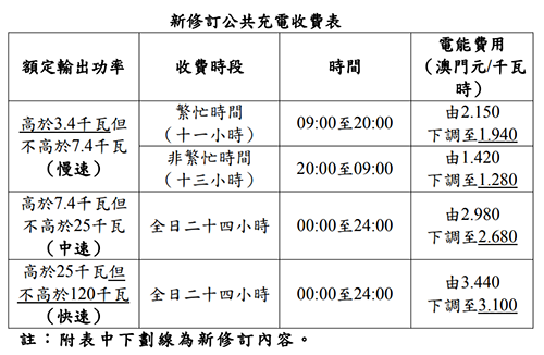 特區政府於2024年透過第66/2024號行政長官批示已調整運輸工具充電收費,下調中、快速公共充電收費的電能費用,並將慢速充電的“非繁忙時間”提前三小時(由晚上11時提前至晚上8時)。特區政府是次透過第1/2026號行政長官批示進一步調整運輸工具的公共充電收費,除劃一下調約10%外,同時亦調整了慢充和快充的額定輸出功率。