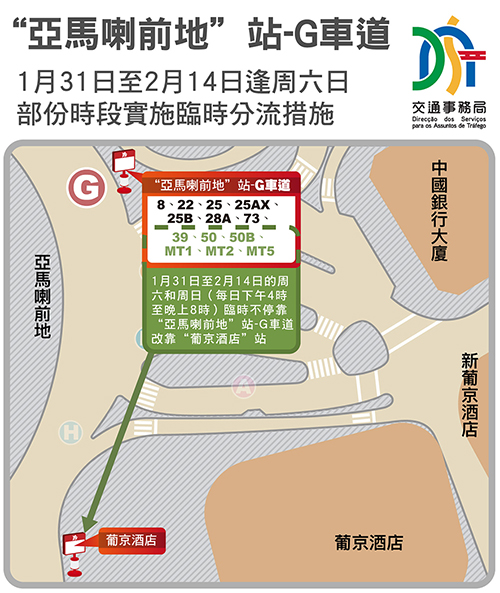 【本報訊】據交通事務局消息,為應對農曆新年前客流增多的情況,亞馬喇前地巴士站G車道的部分巴士路線由本月31日起至2月14日的週六和週日(每日下午4時至晚上8時)改停靠葡京酒店站。