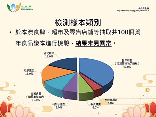 抽取的100個賀年食品樣本包括賀年糕點、西式糖果、瓜子果仁、油器食品、乾製水產品、中式糖果和乾製食用菌等,並進行微生物學或化學檢驗。微生物學檢驗項目包括沙門氏菌屬、金黃色葡萄球菌和蠟樣芽孢桿菌;化學檢驗項目則包括黃曲霉毒素B1、防腐劑及重金屬等。根據化驗結果,所有樣本均未見異常。