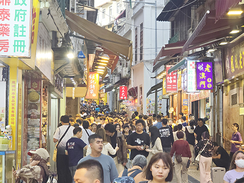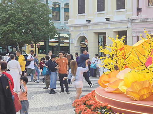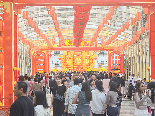 丙午馬年日近,澳門大小街巷張燈結綵,喜氣洋洋,多處旅遊地標連日來人流暢旺。昨日迎來內地春節長假首日,關閘廣場的入境風雨走廊上午人如潮湧,不少旅客一家大小結伴來澳遊玩,綜合度假休閒企業穿梭巴候車區大打蛇餅。在中區議事亭前地一帶及氹仔官也街,旅客大軍或在手信店掃貨,或對著節慶燈飾打卡拍照。此外,亦有一些旅客專程來澳置辦年貨,手提大包小包的戰利品,收穫豐富。有手信店的店主對新春市場充滿信心,其受訪稱,春節是銷售旺季,店中備貨充足,還有優惠促銷措施,希望能為顧客帶來更好購物體驗。