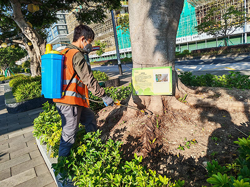 【本報訊】市政署持續巡查及護理各區街道樹木,以維護樹木健康及公眾安全。早前,樹木養護人員經巡查發現觀音像海濱休憩區兩株榕樹感染褐根病,正持續進行救治並已掛上告示牌,讓市民知悉樹木狀況。