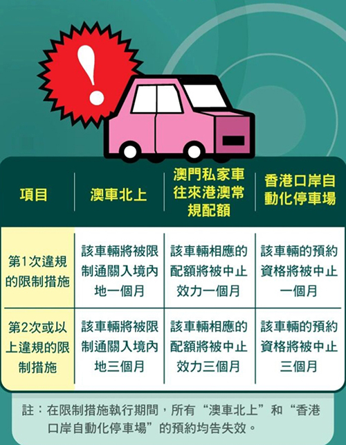 另根據“澳門私家車預約使用香港口岸自動化停車場的登記及應遵事宜”的公告的相關規定,不論是獲許可預約使用停車場的車輛未有遵循“澳車北上”的預約規則下進入內地或港澳常規配額車輛未有遵循“澳車北上”的預約規則下進入內地的首次違反,將同時導致被禁止預約使用停車場一個月及相應的港澳常規配額可被中止效力一個月,而其隨後的任一續後的每次違反將同時導致被禁止預約使用停車場三個月及相應的港澳常規配額可被中止效力三個月。而在限制措施執行期間,所有“澳車北上”和“香港口岸自動化停車場”的預約均告失效。