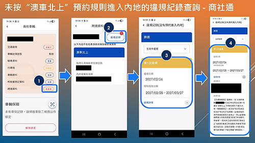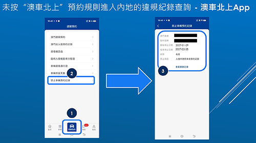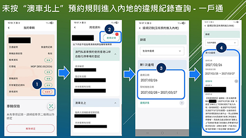 有關預約通關規則及限制措施詳情,可瀏覽“澳車北上”專頁(https://www.dsat.gov.mo/mcars-to-gd/index.aspx )相關內容。交通事務局將透過短訊、一戶通提示信息、“澳車北上”系統推送信息通知違規車輛的申請人(車主)和駕駛人;相關人士亦可透過“澳車北上”系統的查詢頁面,以及“一戶通/商社通”內“我的車輛/商社車輛”之跨境車輛資料中查閱相關紀錄。