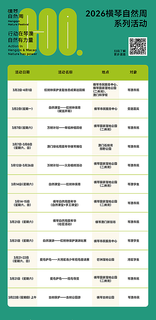 【本報訊】早春時節,萬物復甦,由橫琴粵澳深度合作區城市規劃和建設局主辦的第四屆橫琴自然周如約啟幕,數十場生態活動由本月起陸續舉行,包括紅樹林保護主題生態成果巡迴展、嘉年華、“萬樹計劃”義務植樹、自然課堂及觀鳥導賞等,誠邀琴澳市民尤其是青少年朋友共同參與,共同成為生態保護的踐行者。