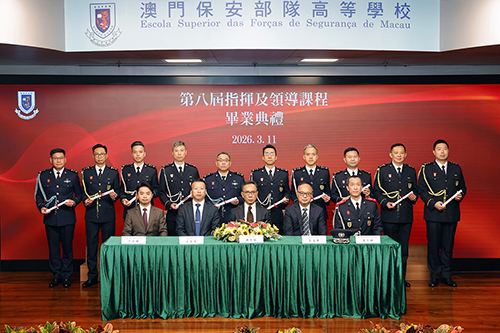 保安高校校長黃子暉致辭時表示,因應社會穩定發展的需要,保安高校持續為澳門保安部隊及保安部門培養領導和高級指揮官人才,於去年9月開辦“第八屆指揮及領導課程”,儲備維護社會長治久安的堅實力量。本屆指揮及領導課程共有10名有10名來自澳門海關、治安警察局和消防局的廳長官員修讀。課程分為學術和實踐領域兩部分,學科涵蓋策略管理、危機管理、經濟及公共財政、國際關係及組織、社會安全及民防規劃等,並安排學員前往重慶市考察當地警務、消防及海關部門在智慧警務、人工智能應用、消防救援及智慧海關建設等前沿領域。課程理論與實務並重,著力提升人員領導力、決策力和處變能力,更好地應對公共安全挑戰。