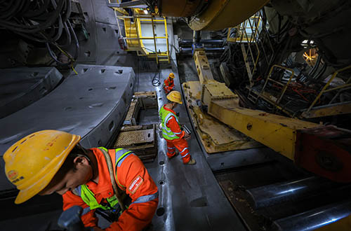 針對深莞隧道穿越弱風化岩層和上軟下硬地層等複雜工況,項目團隊對盾構機進行針對性和創新性設計,應用刀具磨損監測和管片上浮智能監測等智能化系統,安全平穩穿越東寶河,成功實現“透水複合地層超大直徑土壓盾構機長距離穿越水域”,為同類工況施工積累豐富經驗。