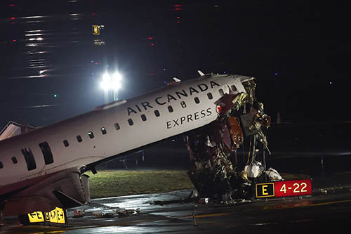 中新社記者23日凌晨在現場看到,一架印有“加拿大航空”字樣的飛機機身傾斜、頭部嚴重損毀並懸空在機場跑道,附近有一輛受損車輛側翻在地,大量救援人員正在現場。