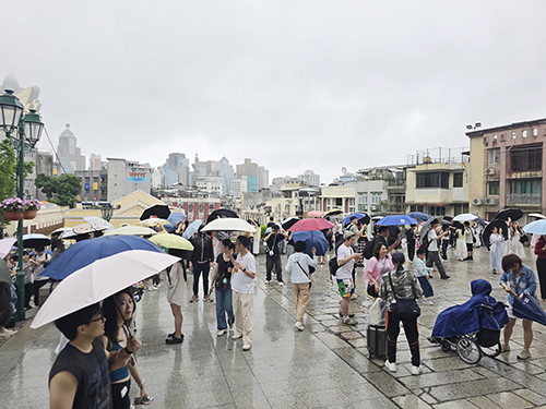 清明時節雨紛紛。盡管昨日天氣欠佳,中區一帶依舊人頭湧湧,不少旅客人撐傘或穿雨衣在大三巴一帶拍照打卡,或在手信街閒逛、試食、購物。氹仔官也街一帶同樣人流暢旺,驟雨天氣無阻旅客遊玩心情。有內地旅客受訪表示,專程趁假期來澳觀看國際乒聯世界盃澳門站賽事,直言打算留澳過夜,即使假期酒店房價上升,尚可接受。另有香港旅客指,假期扎堆前往內地遊玩的人比較多,為此選擇來澳一日遊,品嚐地道美食。有小食店負責人稱,假期人流與平日週末相若,期望天氣好轉,方便旅客遊覽及消費,帶動生意額。
