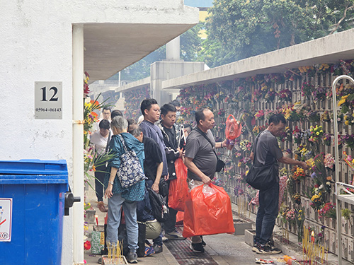 昨日清明節間中有驟雨,仍無阻一眾孝子賢孫拜祭先人,上午可見新西洋墳場外有交通警員協助疏導人潮和指揮交通,整體秩序大致良好。墳場內設廣播呼籲居民安全拜祭,一眾掃墓人士手握鮮花、提著大袋香燭冥鏹,或備好金豬、燒肉及生果等食品到場拜祭,並自覺將冥鏹放入指定化寶桶或化寶爐燃燒,及清理拜祭過後的物品離開,現場環境大致整潔。