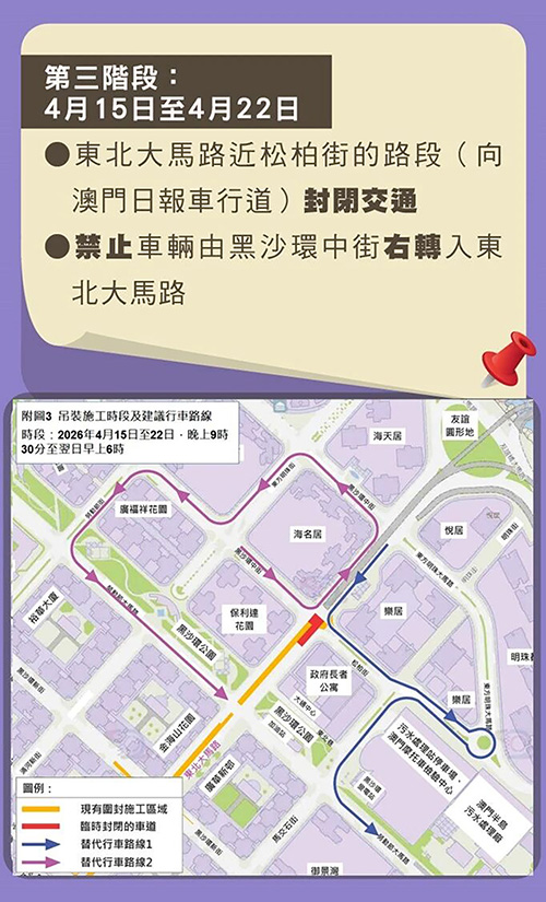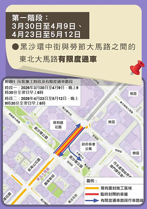 根據交通事務局公佈的相關交通管制措施,3月30日至4月9日及4月23日至5月12日夜間時段(晚上9時30分至翌日早上6時,下同),黑沙環中街與勞動節大馬路之間的東北大馬路實施有限度通車;4月10日至14日夜間時段,黑沙環新街與勞動節大馬路之間的東北大馬路(向友誼圓形地車行道)及勞動節大馬路與黑沙環中街之間的一段東北大馬路(往友誼圓形地方向)實施封閉交通,東北大馬路與東方明珠街之間的一段黑沙環中街改為無出口道路,禁止車輛由勞動節大馬路左轉入東北大馬路,而行經相關路段的車輛需繞道;4月15日至22日夜間時段,東北大馬路近松柏街的路段(向澳門日報車行道)實施封閉交通,禁止車輛由黑沙環中街右轉入東北大馬路,行經相關路段的車輛需繞道;5月13日至14日夜間時段,黑沙環新街與勞動節大馬路之間的一段東北大馬路(向友誼圓形地車行道)及勞動節大馬路與黑沙環中街之間的一段東北大馬路(向友誼圓形地車行道)實施封閉交通,禁止車輛由勞動節大馬路左轉入東北大馬路,行經相關路段的車輛需繞道;5月15日至18日夜間時段,松柏街與勞動節大馬路之間的東北大馬路(往勞動節街大馬路方向)實施封閉交通,東北巷改為無出口道路,禁止車輛由黑沙環中街右轉入東北大馬路,行經相關路段的車輛需繞道。