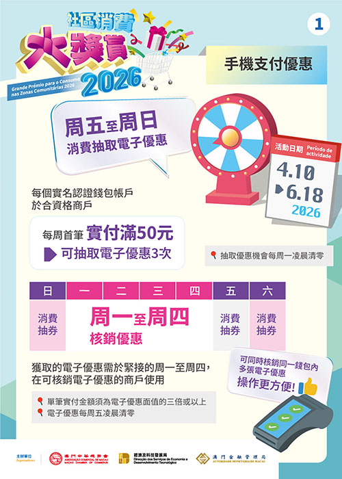 “2026社區消費大獎賞”活動時間為期10周,是次活動抽取電子優惠時間為活動期間的週五、六、日,居民使用承辦單位已“實名認證”的電子錢包,在全澳合資格商戶單筆消費實付滿50元,即可抽取3次電子優惠(每個實名認證錢包賬戶每周抽取優惠上限3次),抽取優惠機會每週一凌晨清零。電子優惠面額為10元、20元、50元、100元及200元,須於緊接的週一至週四在全澳超過2萬間可核銷電子優惠的線下商戶使用,單筆實付金額須為電子優惠面值的三倍或以上方可使用。如單一電子錢包同時擁有多張電子優惠,當消費金額符合三倍核銷條件時,電子優惠將自動在單一交易內核銷。電子優惠於每週五凌晨清零,逾期視作失效。活動延長電子優惠的核銷時間至四天,讓居民有更充裕的時間核銷電子優惠及更好規劃消費。