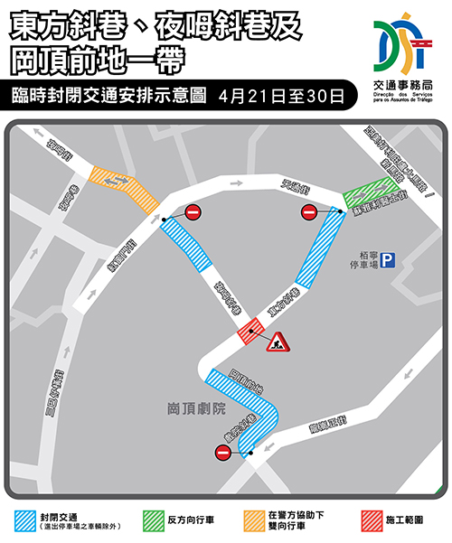 根據交通事務局公佈的相關臨時交通安排,明日起至下週一(20日),東方斜巷近夜呣斜巷的路段有限度通車。下週一起本月30日,東方斜巷近天通街的電單車泊車位禁止泊車。下週二(21日)至本月30日,東方斜巷與夜呣斜巷交界封閉交通,而東方斜巷、夜呣斜巷、岡頂前地及戲院斜巷同樣封閉交通,但進出停車場之車輛除外;此外,蘇雅利醫士街實施反方向行車,介乎紅窗門街與夜呣巷之間的一段夜呣街在警方協助下實施雙向行車。