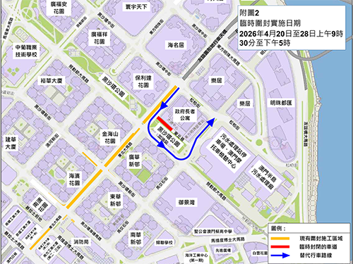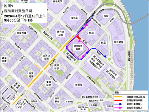 【本報訊】據公共建設局、交通事務局消息,為配合東北大馬路空中走廊鄰近樂居及黑沙環公園的落腳點進行鋼結構吊裝,於4月17日至18日每日上午9時30分至下午1時,禁止車輛由東北大馬路左轉入松柏街,東北巷亦將於4月20日至28日每日上午9時30分至下午5時期間改為無出口道路,期間途經松柏街及東北巷的車輛須繞道其他道路(詳見附圖1及2)。兩局呼籲公眾提前掌握即時交通訊息,提早規劃出行路線,現場亦會架設指示牌引導駕駛者。