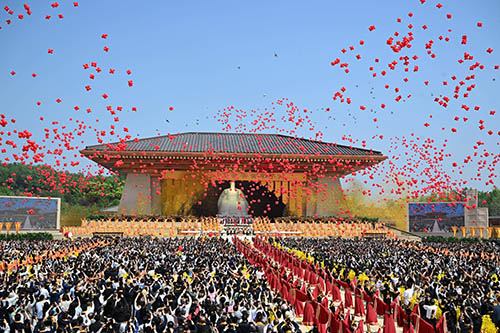 當日,來自海內外的拜祖嘉賓佩戴黃色絲巾,沿著拜祖通道步入拜祖廣場,共同參加大典的九項儀程——盛世禮炮、敬獻花籃、淨手上香、共拜始祖、恭讀拜文、高唱頌歌、樂舞敬拜、祈福中華、天地人和。