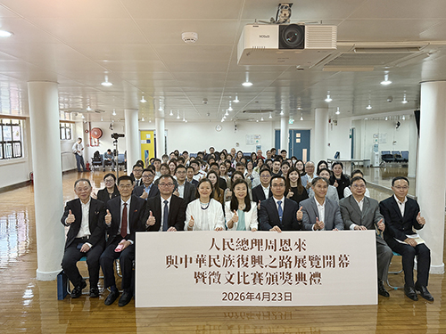 “人民總理周恩來與中華民族復興之路”展覽開幕式暨徵文比賽頒獎典禮於昨日上午11時半在祐漢活動中心三樓禮堂舉行,澳門中聯辦宣傳文體部副部長白冰,澳門基金會行政委員會代主席鍾怡,教青局教育資源廳廳長鄧偉強,文化局職務主管黃潤盈,市政署公民教育處代職務協調員梁安訊,全國政協委員、天津市政協常委及澳門天津聯誼會會長陳季敏,全國政協委員、天津市政協委員及澳門天津聯誼會理事長邱庭彪,天津市政協委員、澳門天津聯誼會副會長林中賢,天津政協委員、澳門天津聯誼會副理事長陳俊拔,周恩來鄧穎超紀念館副館長馬忠庚,南光(集團)有限公司副總經理兼澳門文化推廣協會會長宋曉冬等出席並主禮。