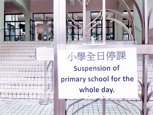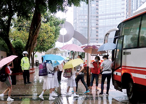 教青局在紅雨警告發出後,即時宣佈小、幼及特殊教育全日停課,中學上午停課,惟當其時已有不少學生正在回校途中。昨早7時半許,已有不少家長和學生聚集在各區學校門口,學校在校門顯眼處貼出停課告示,現場亦有老師及校工告知停課安排,同時開放校舍讓學生入內暫避,並提供校巴接載學生回家。