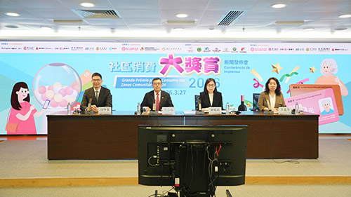 “2026社區消費大獎賞”新聞發佈會於昨日中午12時半在南灣羅保博士街一至三號國際銀行大廈經濟及科技發展局七樓會議室舉行,經濟及科技發展局代局長鄭曉敏、澳門中華總商會理事長馬志毅、社會工作局家庭及社區服務廳廳長李麗萍以及澳門金融管理局銀行監察廳副總監何仲華出席,介紹活動詳情。
