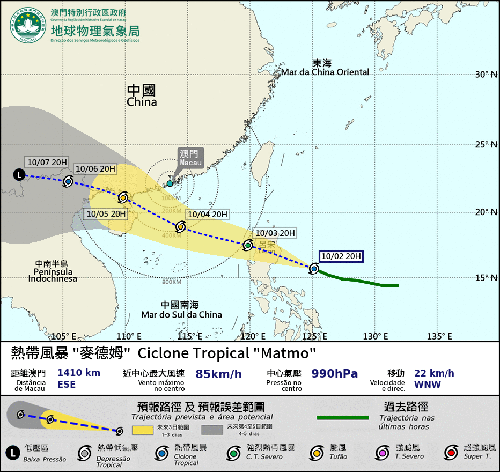 根據氣象局的熱帶氣旋路徑資訊,於昨晚8時,熱帶風暴“麥德姆”集結在菲律賓以東,位於澳門東南偏東約1,410公里處 (約北緯 15.7 度,東經 125.1 度),以時速約22公里向西北偏西方向移動,大致趨向菲律賓。