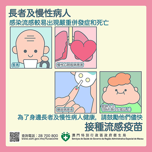 為保障長者、慢性病人、孕婦和幼兒等高風險人群及居民的健康,衛生局自9月30日起已優先為流感高風險人士免費接種2025至2026年度季節性流感疫苗;高風險人士無需預約,可在近期隨診時同步進行接種,而近期未有隨診的高風險人士亦可自行前往各衛生中心/衛生站進行接種;由10月開始,衛生局主動派出醫護人員到本澳各院舍、托兒所及中小幼學校等重點場所進行集體接種,為居民提供不同方式的便利接種服務。