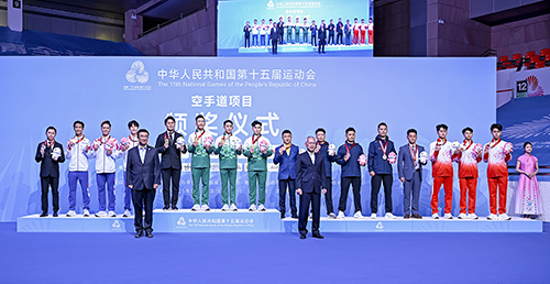 第十五屆全國運動會組委會和全國第十二屆殘疾人運動會暨第九屆特殊奧林匹克運動會組委會執行主任、行政長官岑浩輝一行昨日視察了綜藝館比賽場地,並觀看了男子業餘組團體型的銅牌賽和決賽。賽後,岑浩輝頒發獎牌予賽事的金、銀、銅牌得主,並向澳門代表隊致賀,恭喜本澳運動員在十五運會澳門賽區首項賽事就能奪得首面金牌。