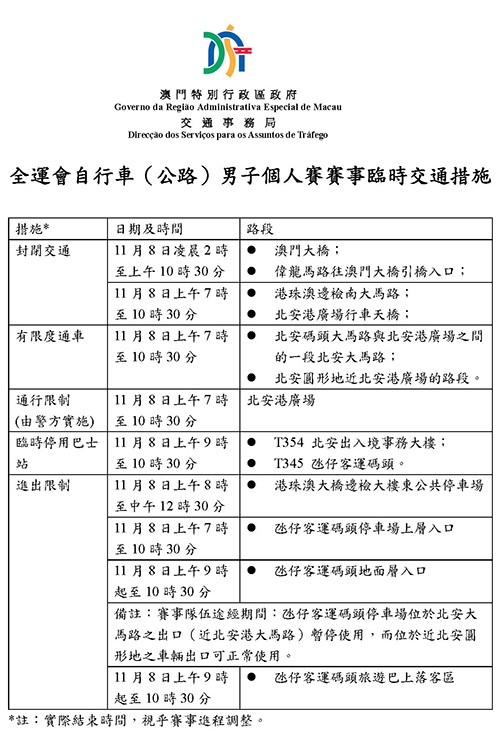 澳門臨時交通和巴士措施方面,澳門大橋及偉龍馬路的部分引橋在當日凌晨2時起封閉交通,氹仔北安部分馬路和港珠澳邊檢南大馬路在上午7時起實施通行限制;另外,兩個巴士站當日上午9時起臨時停用,預計11條巴士線受影響,相關措施預計於10時30分結束(實際結束時間,視乎賽事進程調整)。此外,港珠澳大橋邊檢大樓東公共停車場、氹仔客運碼頭停車場及其上落客區和下層的士站實施進出限制,休聞企業接駁巴士亦臨時停運,以配合賽事舉行。具體措施可查閱交通事務局網站內的相關專頁(https://www.dsat.gov.mo/dsat/subpage.aspx?a_id=1761534451)。