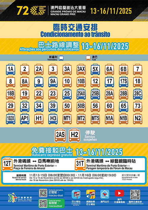 因應大賽車的舉行,今日起至週日期間,賽道及周邊道路分階段實施多項臨時交通管制措施,當中亞馬喇前地與城市日大馬路之間一段仙德麗街臨時由單向改為雙向交通,而福海花園與新雅馬路行車天橋之間的一段新雅馬路臨時改作反方向通車。此外,明日起至週日合共52條巴士路線需作臨時安排,2A特班車(2AS)及H2路線停運,12T及31T免費穿梭巴士路線分別往返外港碼頭至亞馬喇前地及綜藝館。為加強疏導賽道周邊的交通,經跨部門協調,友誼圓形地行車天橋B匝道(由A區往東北大馬路)已通車,黑沙環中街輕軌東線工程及東北大馬路行人天橋工程調整大賽車期間的施工安排,以釋放路面空間。具體的臨時交通及巴士調整可瀏覽交通事務局網站專頁(https://www.dsat.gov.mo/dsat/subpage.aspx?a_id=1761559294)。