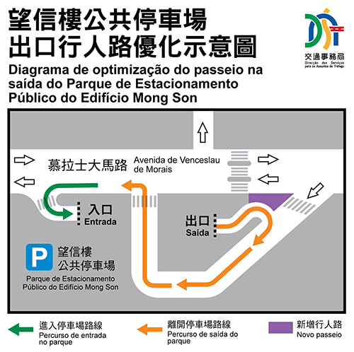 據交通事務局公佈,望信樓公共停車場出入口調整後,車輛將改由近慕拉士政府綜合服務中心(望信樓第2座)的原有出口位置進場,並透過近望信樓第1座的原有入口位置離開。新設計讓駛離車輛可經內街轉入慕拉士大馬路,使出口位置與路口保持約50米的緩衝距離,並可讓駕駛者選擇轉線駛往東北大馬路,從而提升行車效率。