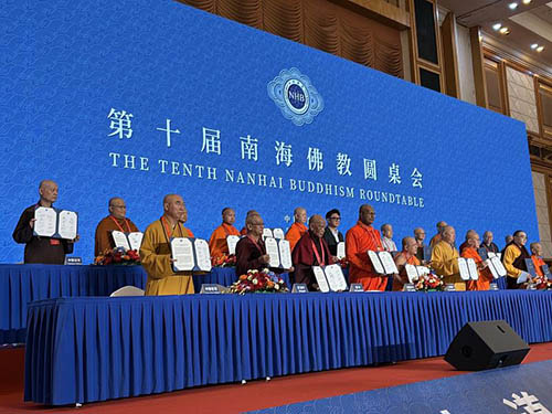 【本報綜合報道】據中新社深圳11月25日消息,第十屆南海佛教圓桌會11月23至25日在深圳舉行。會議邀請了泰國、尼泊爾、斯里蘭卡、印度、英國、美國、俄羅斯等25個國家及中國港澳台地區的佛教代表,圍繞“中道圓融、文明互鑒”主題交流對話,凝聚共識,並共同簽署了《第十屆南海佛教圓桌會倡議書》。