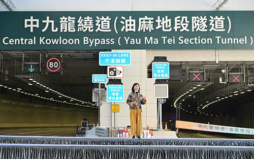 【本報綜合報道】據香港中通社12月21日消息,香港中九龍繞道(油麻地段)當日早上通車,政府早前預計,由油麻地往九龍灣車程,將由繁忙時間約30分鐘減至約5分鐘。香港特區政府運輸及物流局局長陳美寶於通車儀式上致辭表示,這個項目有三個特色:上天、下地、出海。整個過程牽涉不同建造技術,有隧道爆破、天橋,亦有其他周邊設施。