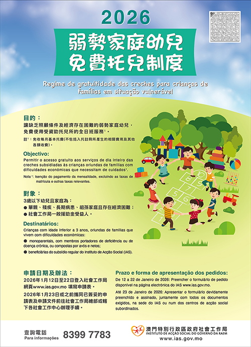 【本報訊】為體現特區政府對弱勢群體的關懷,更有效地精準扶助弱勢群體,減輕弱勢家庭的經濟負擔,社會工作局協調30多間受資助托兒所推出“弱勢家庭幼兒免費托兒制度”,期望為缺乏照顧條件及經濟存在困難的弱勢家庭幼兒提供申請免費使用受資助托兒所服務,合資格弱勢家庭可由本月12日提出申請。
