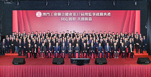 澳門工會聯合總會成立 76周年聯歡晚會暨第 37屆理監事就職典禮昨晚7時假漁人碼頭宴會廳舉行。行政長官岑浩輝,全國政協副主席何厚鏵,中央政府駐澳門聯絡辦公室副主任張應杰,外交部駐澳門特派員公署署理特派員程雷,立法會主席張永春,經濟財政司司長戴建業,工聯總會會務顧問劉焯華,中國職工交流中心主任張廣,廣東省總工會黨組成員、副主席鄭輝,香港工會聯合會副理事長丘耀誠,中央政府駐澳門聯絡辦公室副秘書長兼社會發展部部長黃華蓋,工聯總會會長林倫偉、理事長江銳輝、監事長何雪卿,以及工運前輩、工會負責人、職工代表及社會各界人士出席。