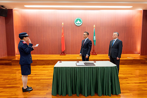 【本報訊】澳門海關助理關長吳嘉慧的就職儀式昨日上午在保安司司長辦公室舉行。儀式由保安司司長陳子勁主持,吳嘉慧在海關領導及一眾官員的見證下進行宣誓及簽署就職狀,就任海關助理關長。