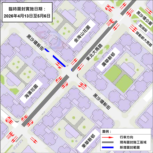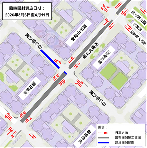 為此,公共建設局與交通事務局經協調後,預計由本今日起分三階段對海濱花園與金海山花園之間的一段黑沙環新街(近東北大馬路區域)進行局部圍封,並實施有限度通車,以保障東北大馬路與黑沙環新街交匯處至少保持雙線行車(具體安排見附圖)。