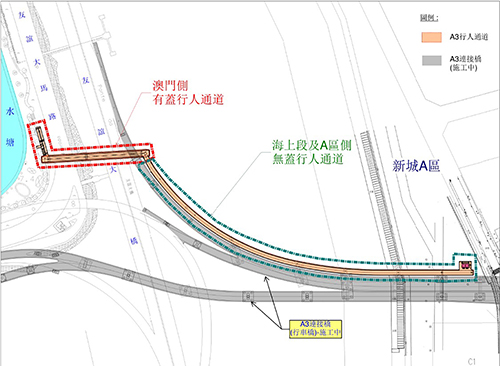 為滿足澳門半島與新城A區之間的行人往來需求,按照東區-2詳細規劃,正在興建的A3連接橋旁邊增設行人通道以連接澳門半島水塘步行徑及新城A區的濱海綠廊。行人通道全長約400米,橋面最小寬度4米,從澳門側水塘起步,跨越友誼大馬路和友誼大橋後,轉而與興建中的A3連接橋(行車天橋)並行,終點位於新城A區的海濱綠廊側落地後連接至濠江大馬路。