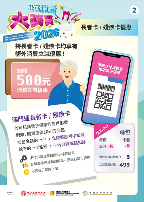 活動期間,長者及持殘評證人士繼續享有額外500元的“消費立減優惠”,合資格人士須持有效澳門通“長者卡”或“殘疾卡”,在本澳逾100個指定服務地點拍卡領取。持有上述卡式消費立減優惠者於可核銷電子優惠的商戶進行消費時,交易金額的一半(50%)從立減優惠額中扣減(即五折優惠),餘下的一半(50%)金額從自行充值的餘額中扣除。換言之,持卡者可透過立減優惠,在整個活動期間,以500元自資金額,購買總值1,000元的商品或服務。